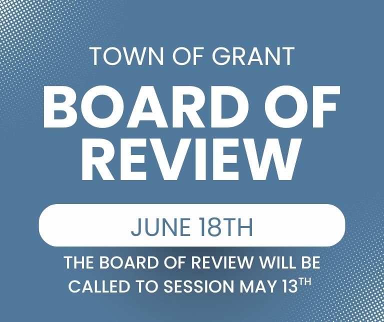 NOTICE IS HEREBY GIVEN THAT The Board of Review for the Town of Grant of Portage County shall open the Board of Review on the 16th day of May 2025 from 2:00PM – 4:00PM, at the Grant Town Hall located at 9011 County Road WW Wisconsin Rapids, Wisconsin 54494.
