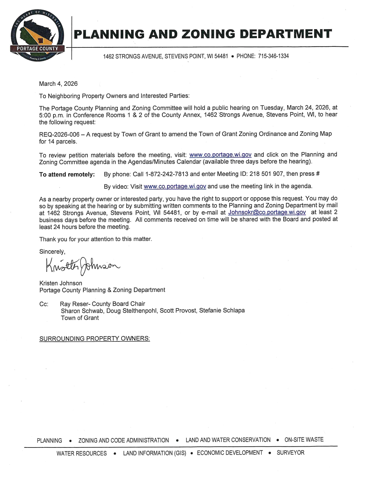 Approved Ordinances & Resolutions: At tonight's town board meeting, the board passed the following ordinances and resolutions: To join the Local Government Investment Pool (Resolution 2026-01) To Support a Comprehensive & Sustainable Transportation Funding Solution (Resolution 2026-02) An ordinance related to the confidentiality of information about Income and Expenses requested by the assessor in property assessment matters in Town of Grant (Ordinance 2026-02) Zoning Ordinance 2026-01 These are now available on the Ordinances, Policies, and Resolutions page on the website. Additional website updates are in progress.